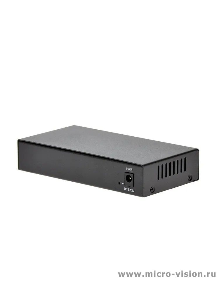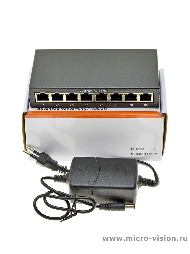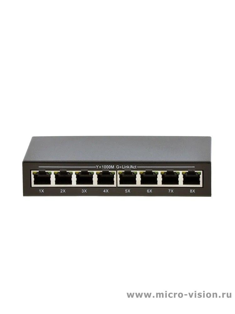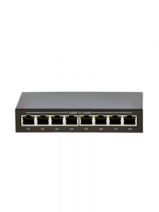 Коммутатор оснащен 8 портами 10/100/1000 Мбит/с к каждому из которых можно подключать сетевые устройства (IP-камеры, IP-телефоны, беспроводные точки доступа). Выполнен в металлическом корпусе, питается от блока питания с выходным напряжением 5 вольт.
