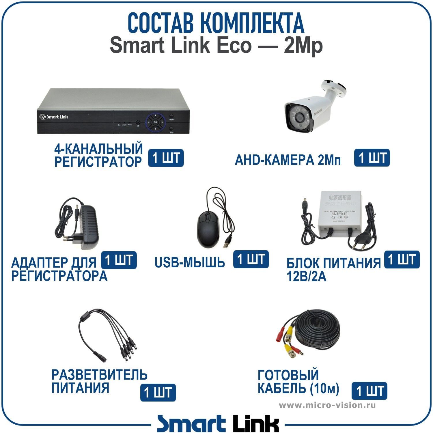 Комплект AHD видеонаблюдения 2Мп на 1 камеру Smart Link SLE-2M2N1B— это готовый набор, включающий в себя 1 уличную камеру, 4-канальный видеорегистратор, обеспечивающий запись камер на жёсткий диск (диск приобретается отдельно), необходимые блоки питания, готовый кабель с разъёмами длиной 10м на каждую камеру, и все остальные комплектующие.