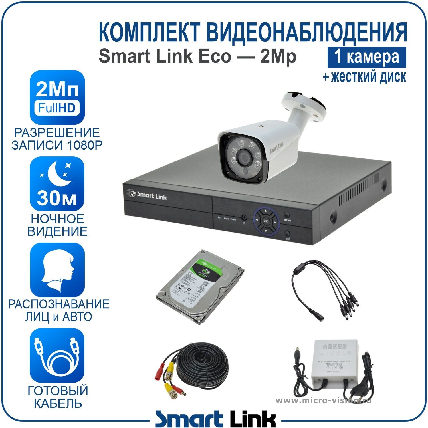 Готовый комплект видеонаблюдения 2Мп уличный, на 1 камеру, с жёстким диском 500Gb, с распознаванием лиц и автомобилей, с удалённым просмотром, для дома, дачи, бизнеса. Smart Link SLE-2M5N1B-H