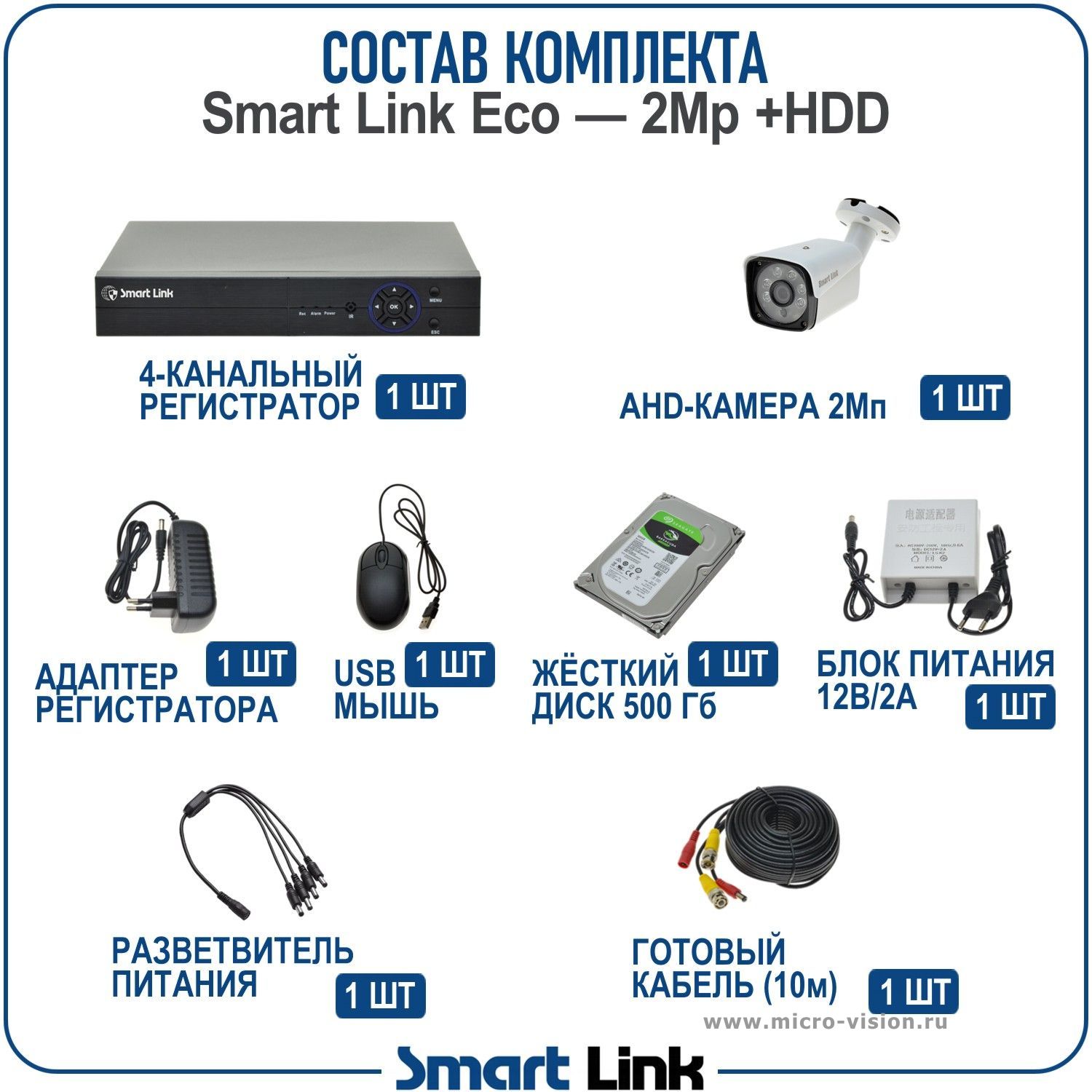 Комплект AHD видеонаблюдения 2Мп на 1 камеру Smart Link SLE-2M5N1B-H— это готовый набор, включающий в себя 1 уличную камеру, 4-канальный видеорегистратор, обеспечивающий запись камер на жёсткий диск (в комплекте диск на 500Gb), необходимые блоки питания, готовый кабель с разъёмами длиной 10м на каждую камеру, и все остальные комплектующие.