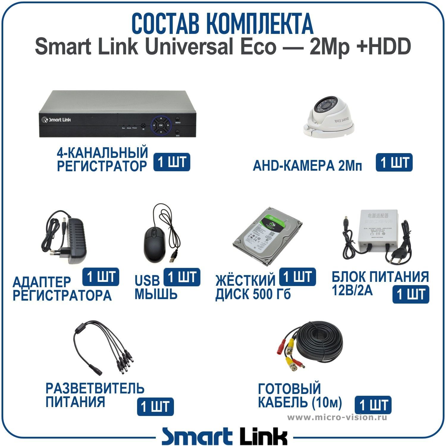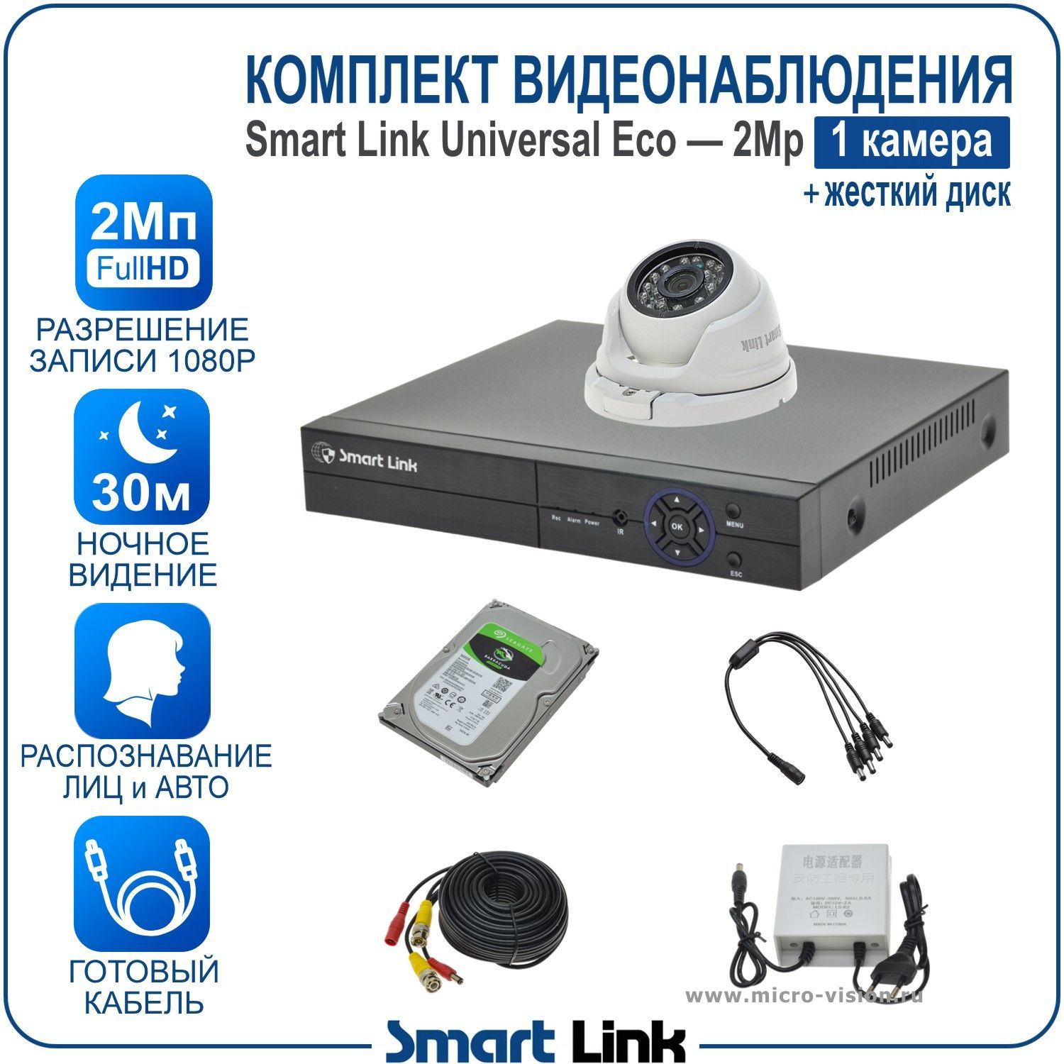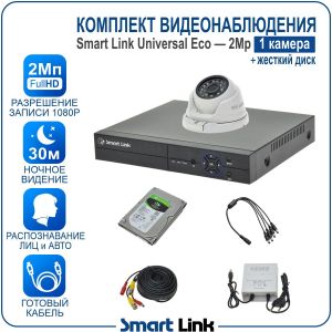 Комплект AHD видеонаблюдения 2Мп на 1 камеру Smart Link SLE-2M5N1M-H— это готовый набор, включающий в себя 1 антивандальную купольную камеру, 4-канальный видеорегистратор, обеспечивающий запись камер на жёсткий диск (в комплекте диск на 500Gb), необходимые блоки питания, готовый кабель с разъёмами длиной 10м на каждую камеру, и все остальные комплектующие.