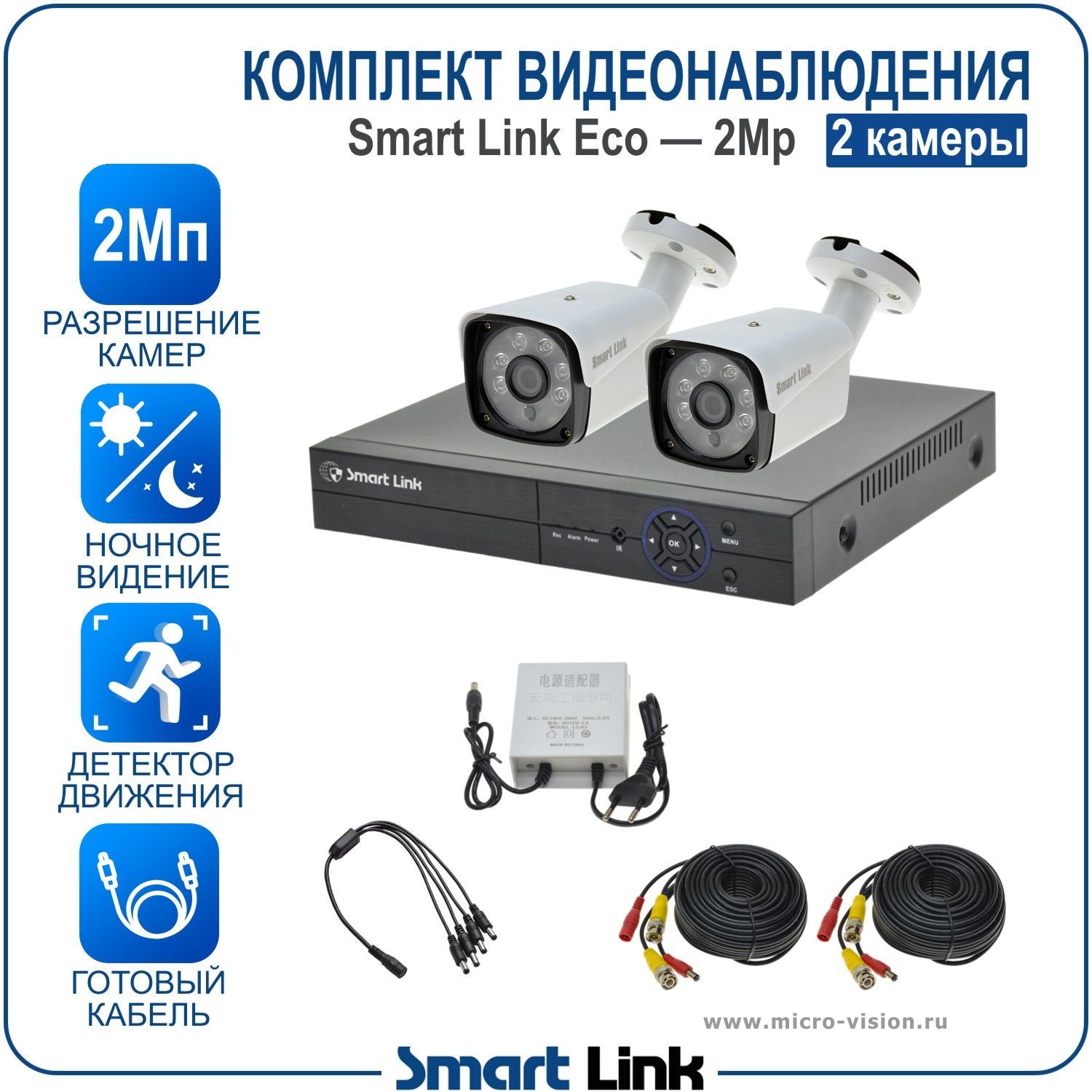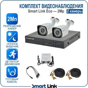 Готовый комплект видеонаблюдения 2Мп уличный, на 2 камеры, с записью на жёсткий диск до 8Tb, с удалённым просмотром, для дома, дачи, бизнеса. Smart Link SLE-2M2N2B