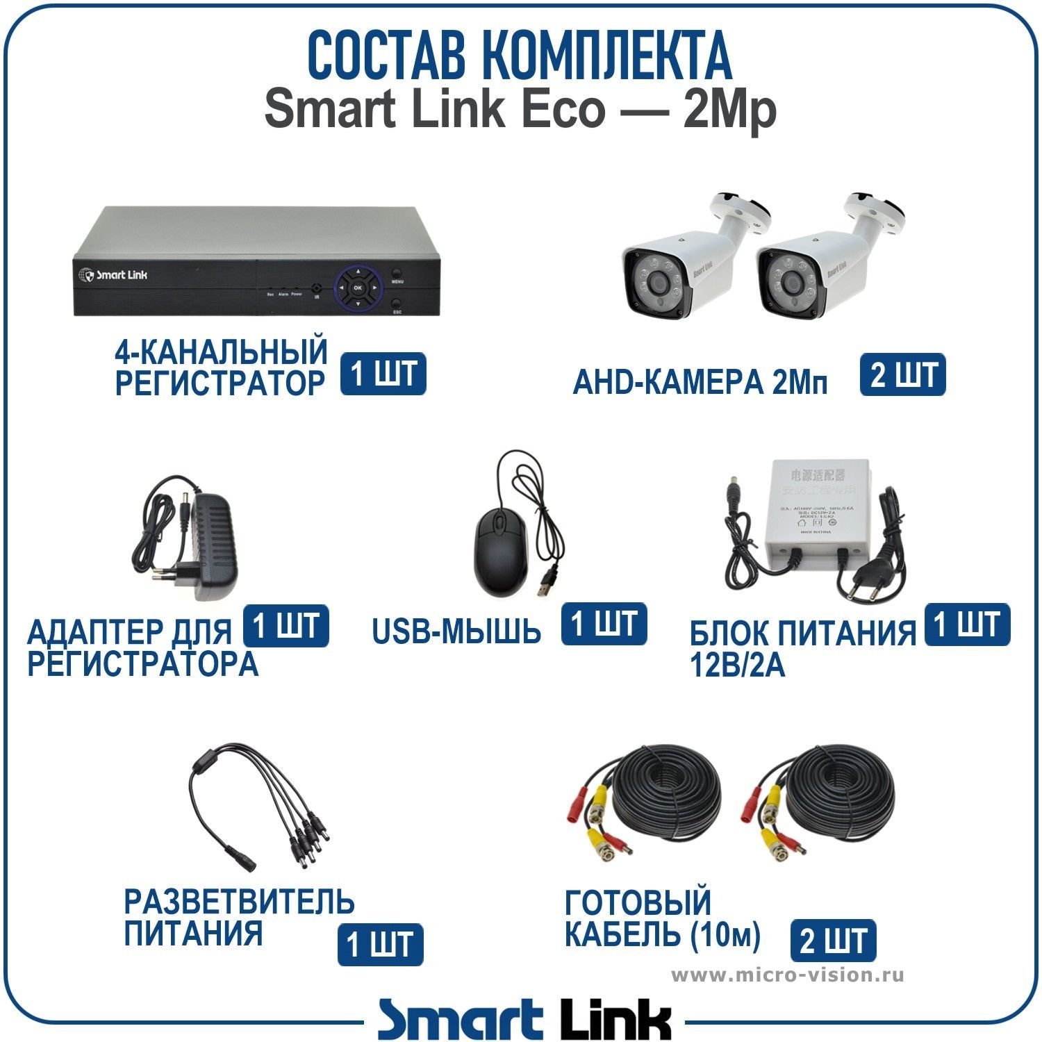 Комплект AHD видеонаблюдения 2Мп на 2 камеры Smart Link SLE-2M2N2B— это готовый набор, включающий в себя 2 уличные камеры, 4-канальный видеорегистратор, обеспечивающий запись камер на жёсткий диск (диск приобретается отдельно), необходимые блоки питания, готовый кабель с разъёмами длиной 10м на каждую камеру, и все остальные комплектующие.