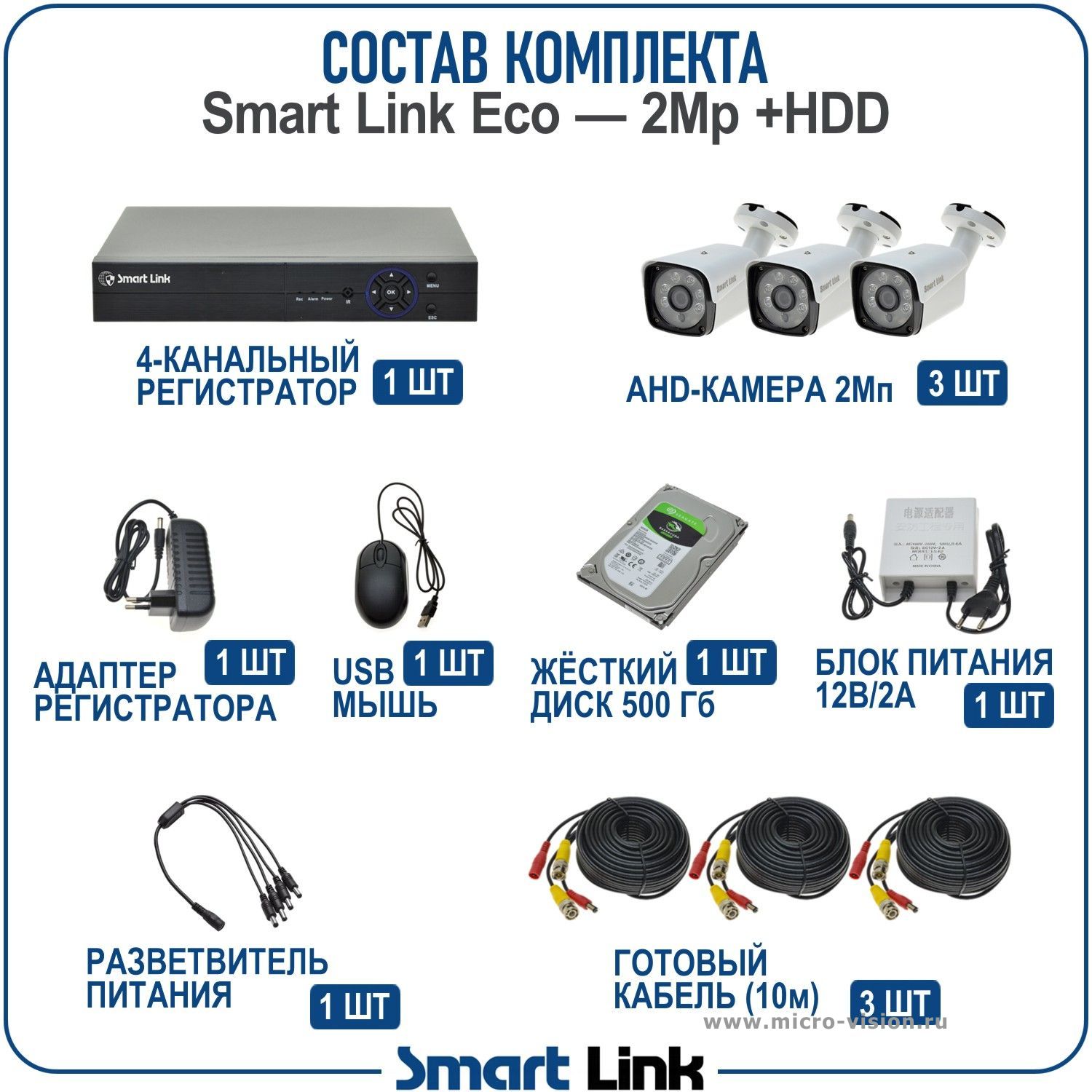 Комплект AHD видеонаблюдения 2Мп на 3 камеры Smart Link SLE-2M5N3B-H— это готовый набор, включающий в себя 3 уличные камеры, 4-канальный видеорегистратор, обеспечивающий запись камер на жёсткий диск (в комплекте диск на 500Gb), необходимые блоки питания, готовый кабель с разъёмами длиной 10м на каждую камеру, и все остальные комплектующие.