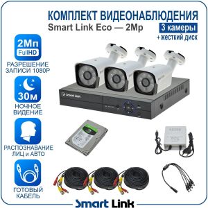 Готовый комплект видеонаблюдения 2Мп уличный, на 3 камеры, с жёстким диском 500Gb, с распознаванием лиц и автомобилей, с удалённым просмотром, для дома, дачи, бизнеса. Smart Link SLE-2M5N3B-H