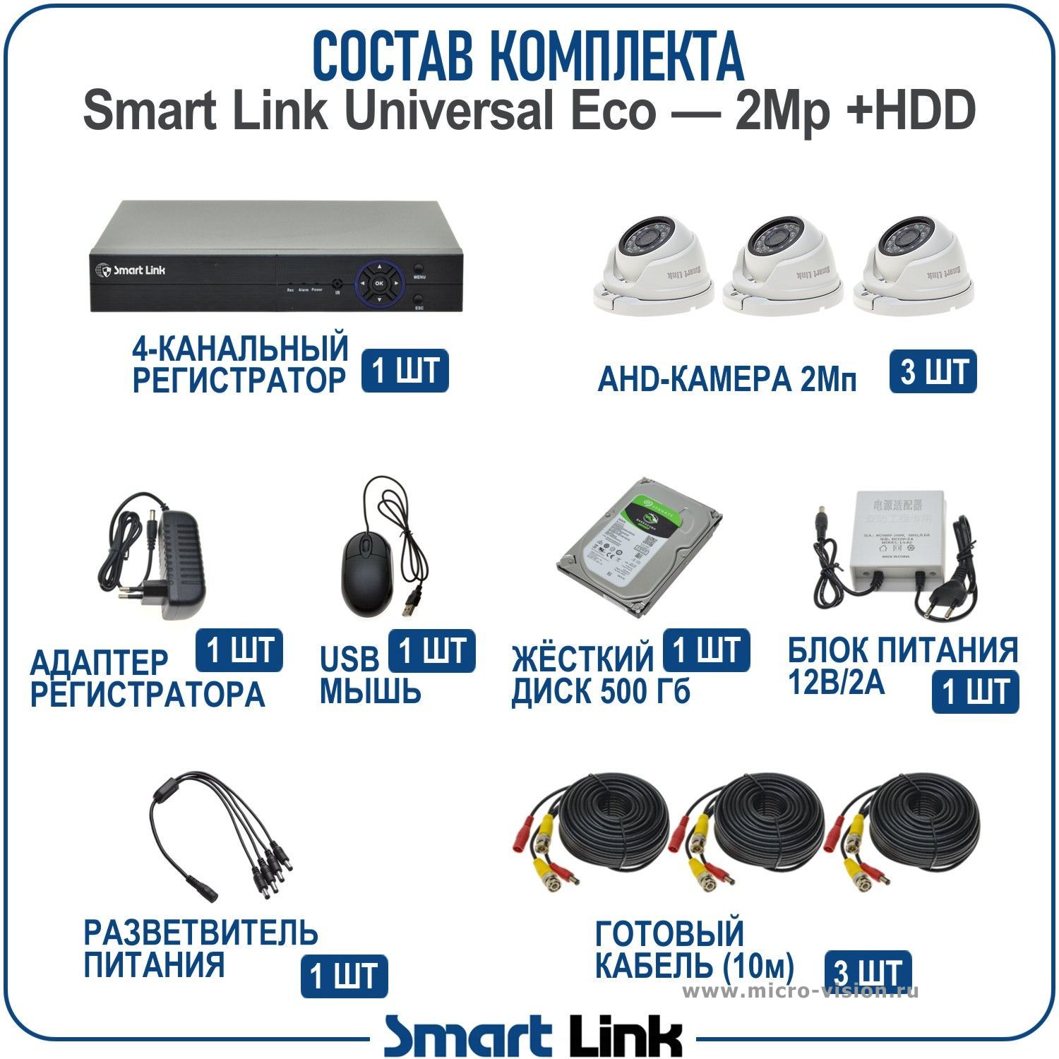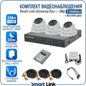 Комплект AHD видеонаблюдения 2Мп на 3 камеры Smart Link SLE-2M5N3M-H— это готовый набор, включающий в себя 3 антивандальные купольные камеры, 4-канальный видеорегистратор, обеспечивающий запись камер на жёсткий диск (в комплекте диск на 500Gb), необходимые блоки питания, готовый кабель с разъёмами длиной 10м на каждую камеру, и все остальные комплектующие.