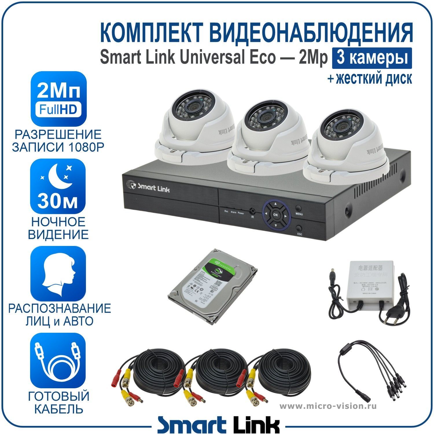 Готовый комплект видеонаблюдения 2Мп уличный, на 3 камеры, с жёстким диском 500Gb, с распознаванием лиц и автомобилей, с удалённым просмотром, для дома, дачи, бизнеса. Smart Link SLE-2M5N3M-H