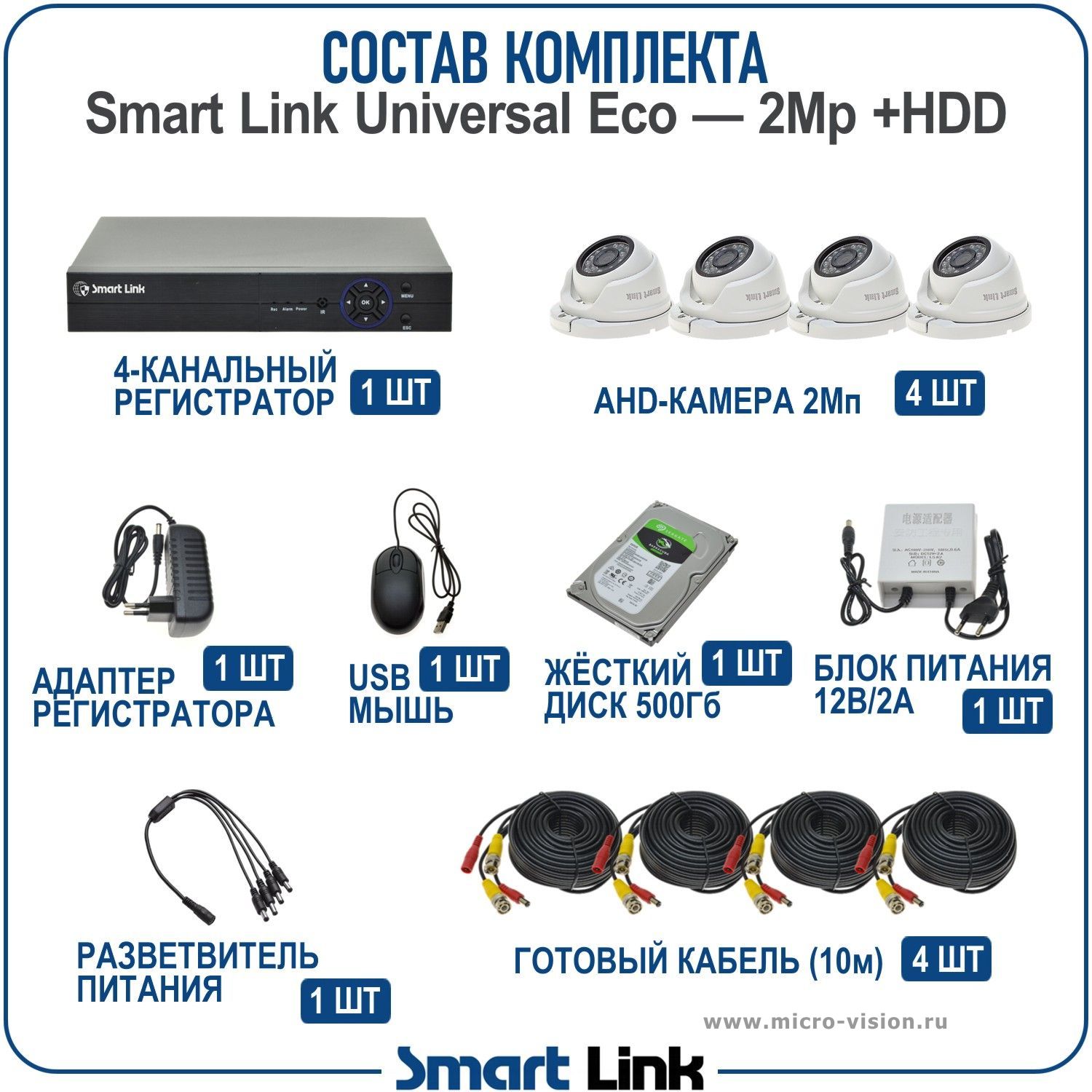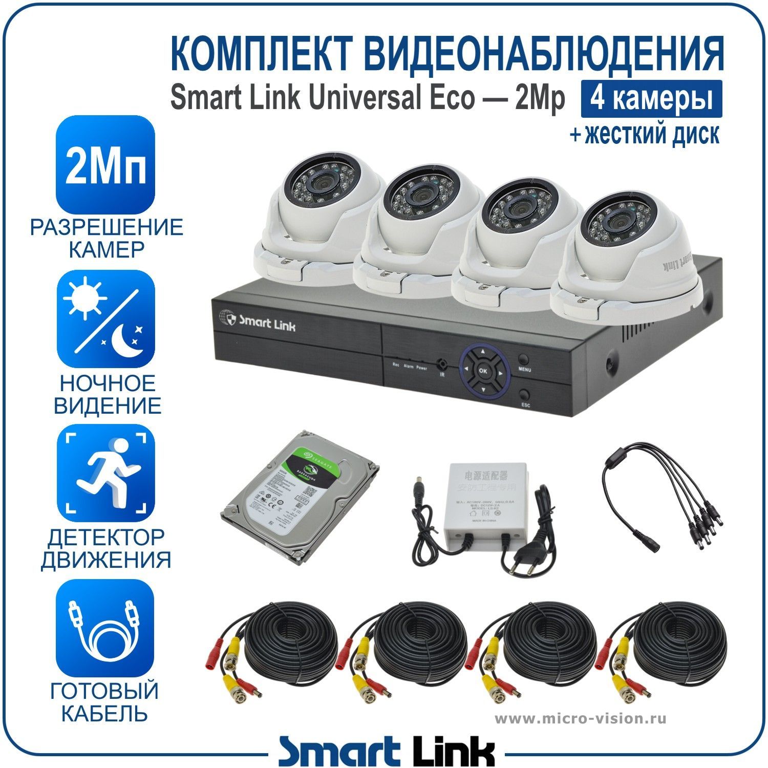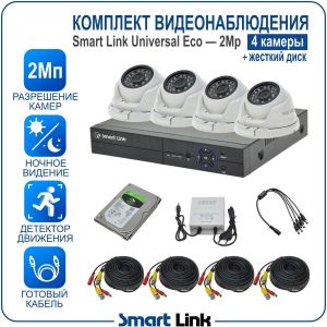 Комплект AHD видеонаблюдения 2Мп на 4 камеры Smart Link SLE-2M2N4M-H— это готовый набор, включающий в себя 4 антивандальные купольные камеры, 4-канальный видеорегистратор, обеспечивающий запись камер на жёсткий диск (в комплекте диск на 500Gb), необходимые блоки питания, готовый кабель с разъёмами длиной 10м на каждую камеру, и все остальные комплектующие.