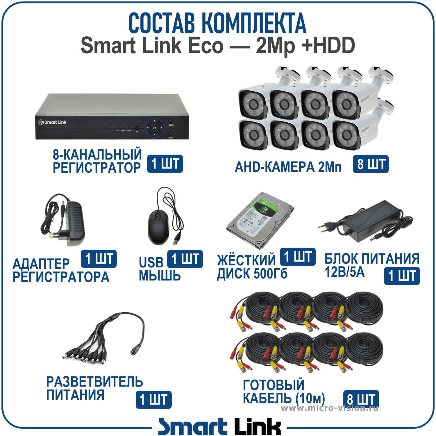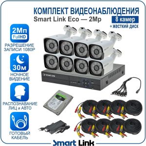 Комплект AHD видеонаблюдения 2Мп на 8 камер Smart Link SLE-2M5N8B-H— это готовый набор, включающий в себя 8 уличных камер, 8-канальный видеорегистратор, обеспечивающий запись камер на жёсткий диск (в комплекте диск на 500Gb), необходимые блоки питания, готовый кабель с разъёмами длиной 10м на каждую камеру, и все остальные комплектующие.