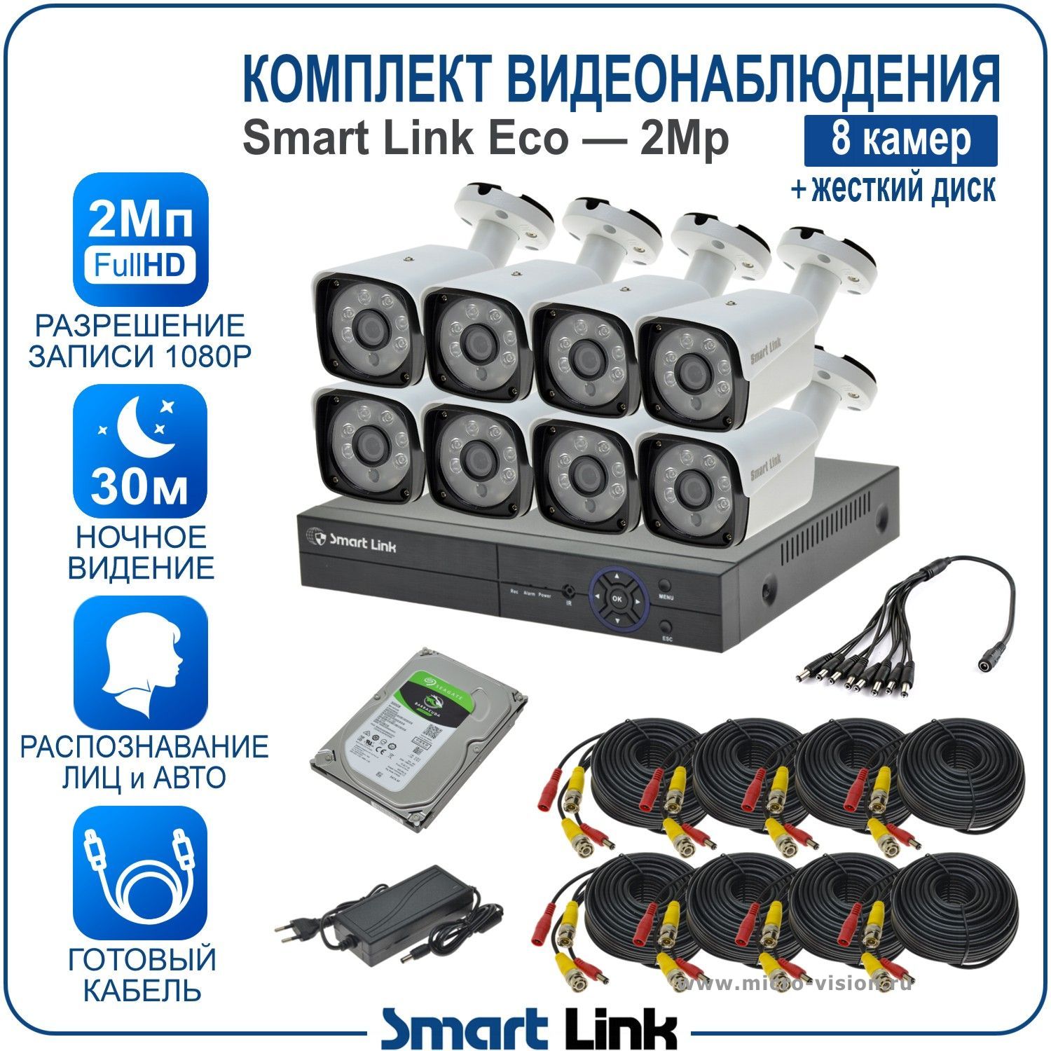 Готовый комплект видеонаблюдения 2Мп уличный, на 8 камер, с жёстким диском 500Gb, с распознаванием лиц и автомобилей, с удалённым просмотром, для дома, дачи, бизнеса. Smart Link SLE-2M5N8B-H