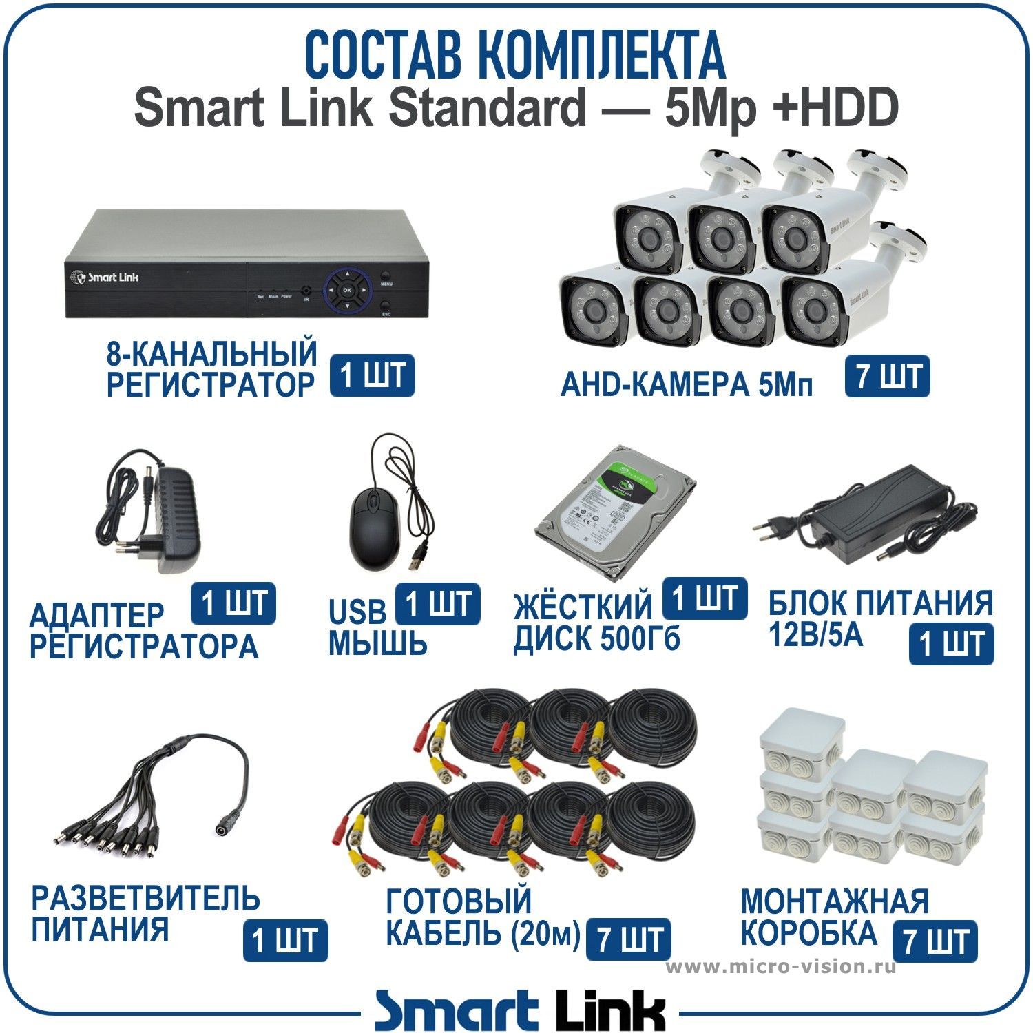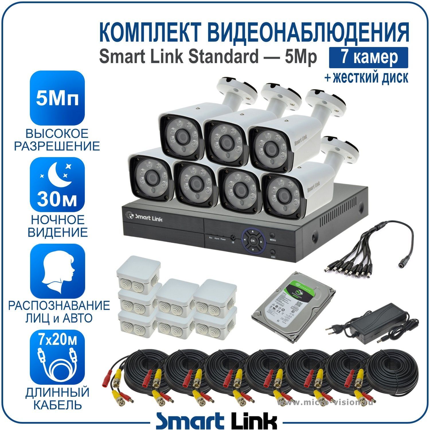 Комплект AHD видеонаблюдения 5Мп на 7 камер Smart Link SL-5M5N7B-H— это готовый набор, включающий в себя 7 уличных камер, 8-канальный видеорегистратор, обеспечивающий запись камер на жёсткий диск (в комплекте диск на 500Gb), необходимые блоки питания, готовый кабель с разъёмами длиной 20м на каждую камеру, и все остальные комплектующие.