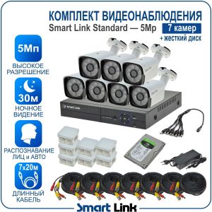 Готовый комплект видеонаблюдения 5Мп уличный, на 7 камер, с жёстким диском 500Gb, с распознаванием лиц и автомобилей, с удалённым просмотром, для дома, дачи, бизнеса. Smart Link SL-5M5N7B-H
