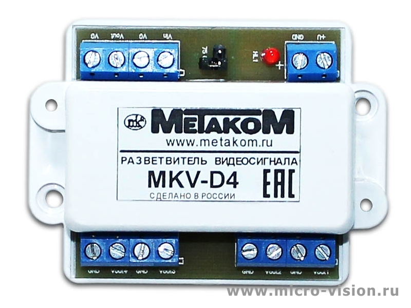Разветвитель видеосигнала МЕТАКОМ MKV-D4(C) предназначен для усиления и распределения видеосигнала от одного источника множеству потребителей, т.е. для подключения абонентских видеомониторов к магистральной линии стандартного видеосигнала в составе домофонных систем.